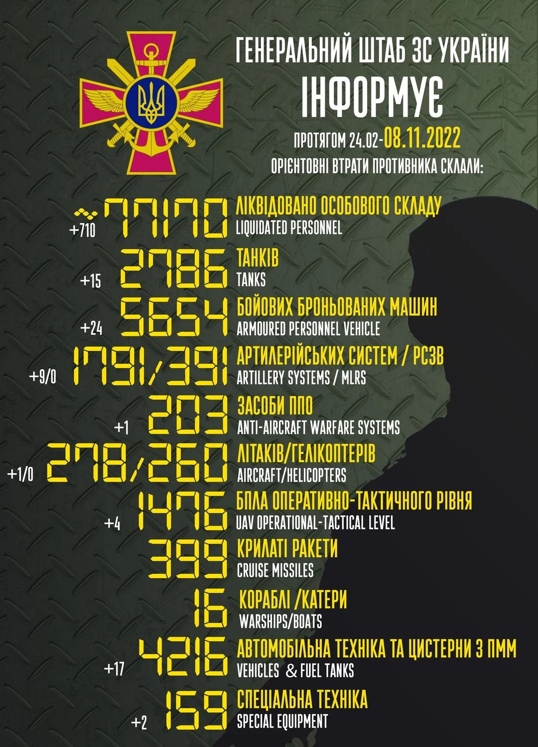Станом на ранок 8 листопада загальні втрати загарбників склали: